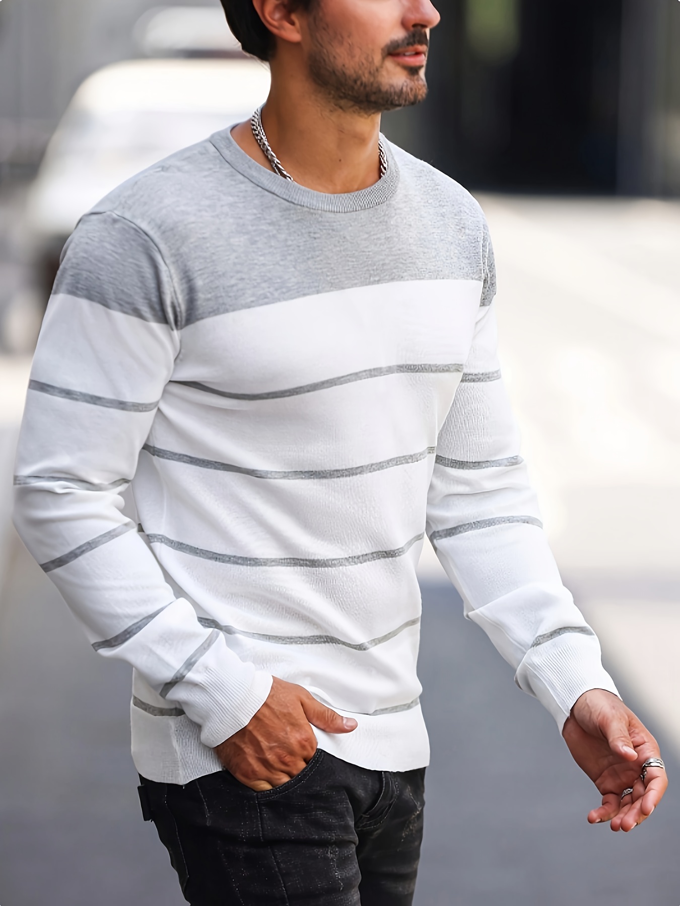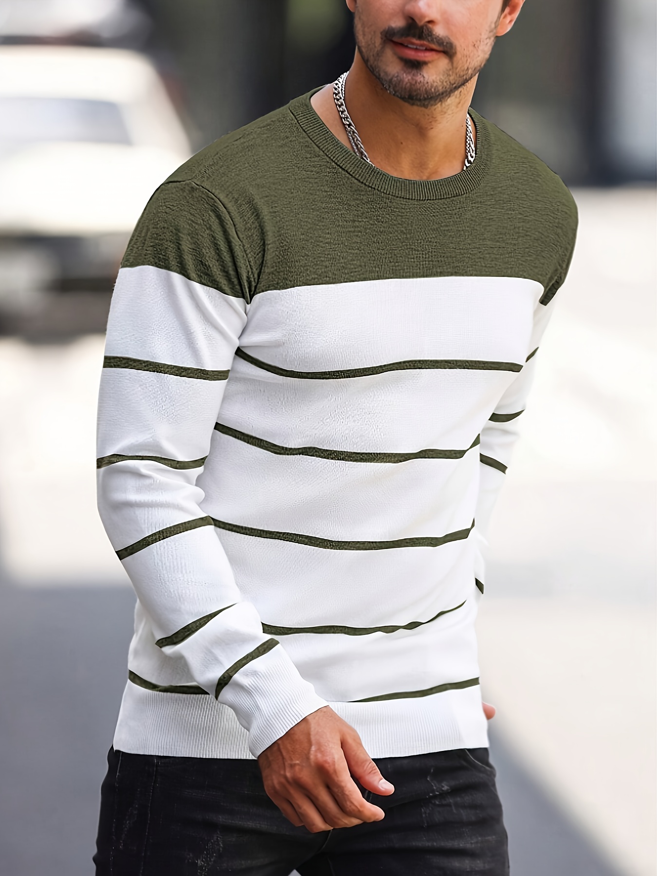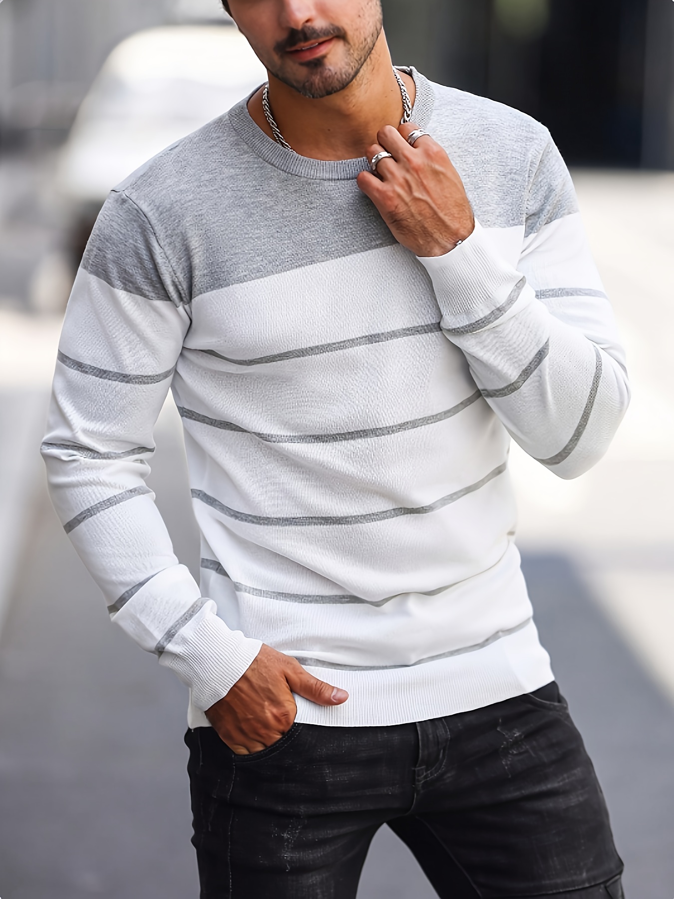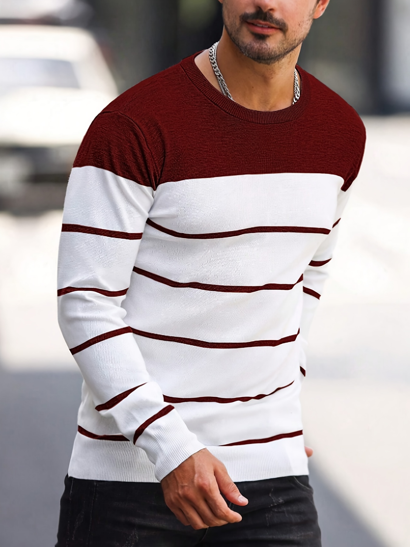 Men's Casual Striped Knit Pullover Sweater - Navy & White Contrast, Regular Fit H-Silhouette, Long Sleeve Crew Neck, Medium Stretch, Machine Washable for Spring & Fall, Medium-Stretch Fabric, Knit Sweater, Seasonal Clothing, Ribbed Detailing, Durable Construction, Versatile Top, Streetwear Style
