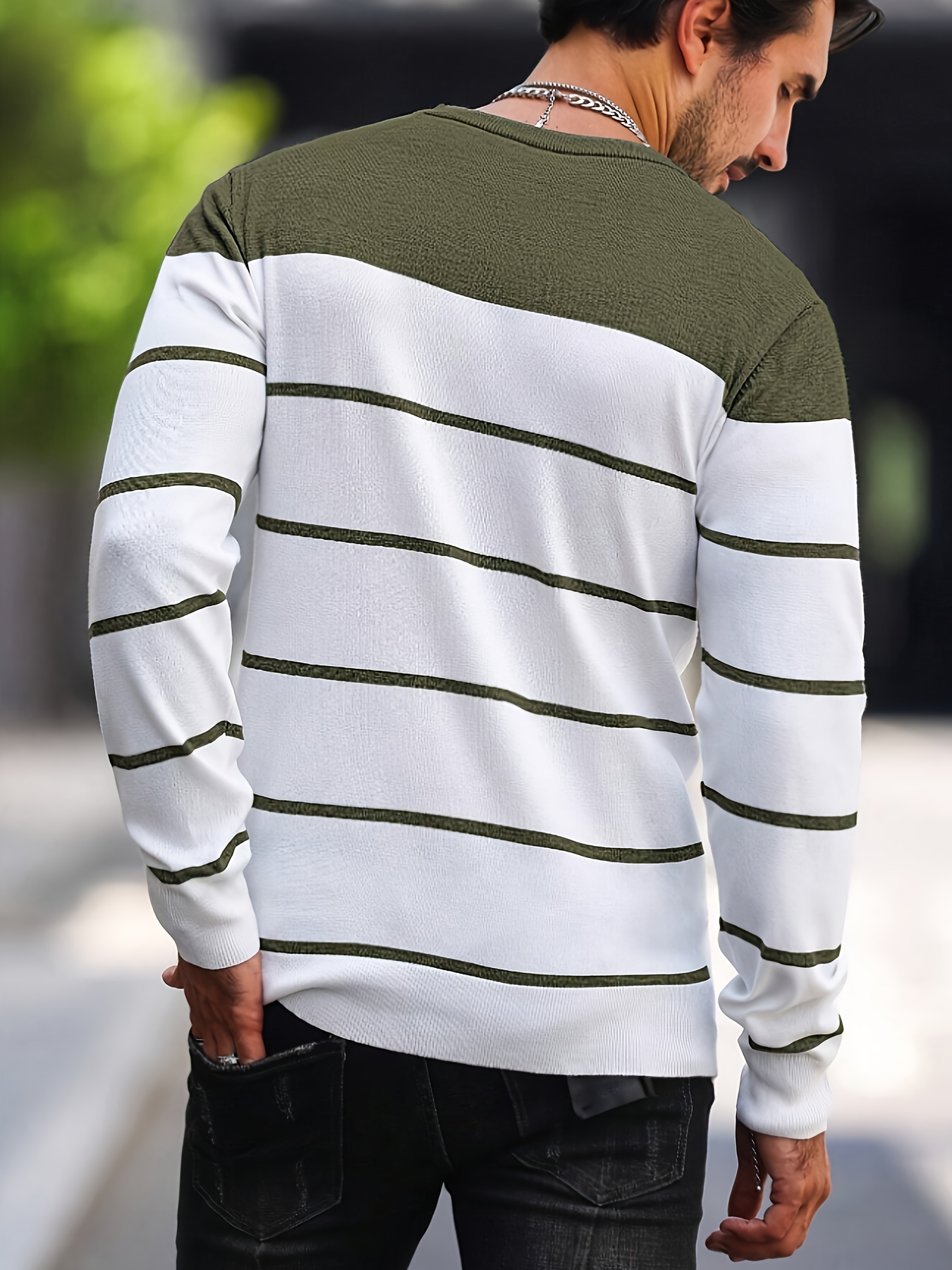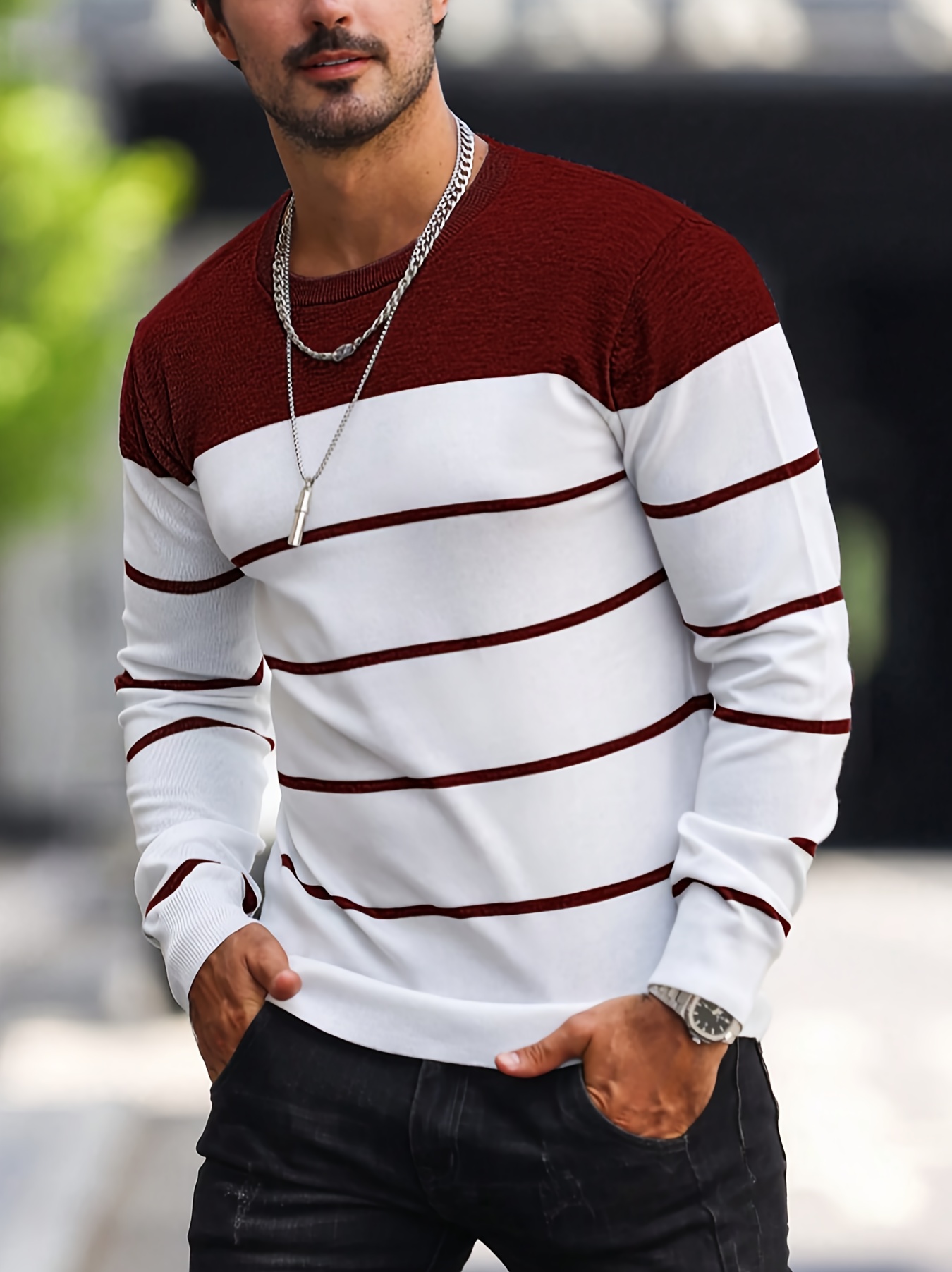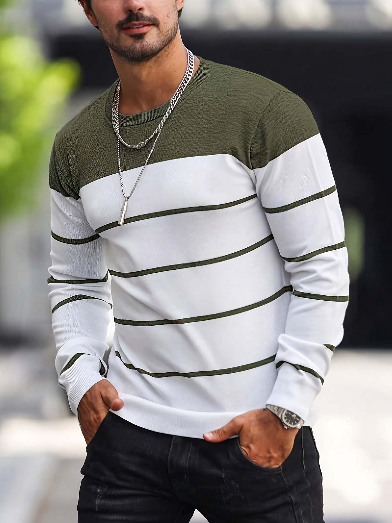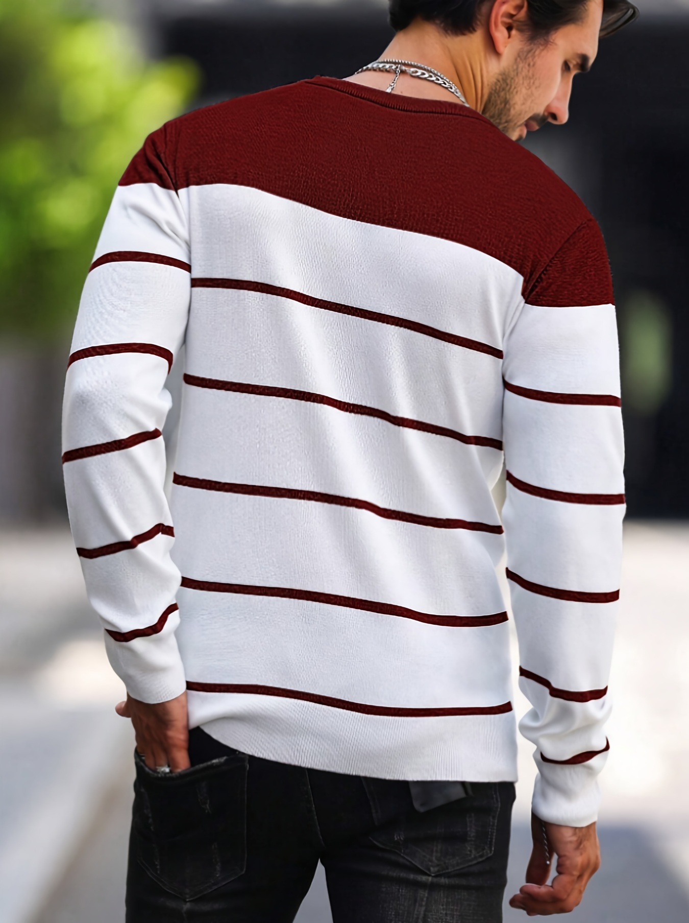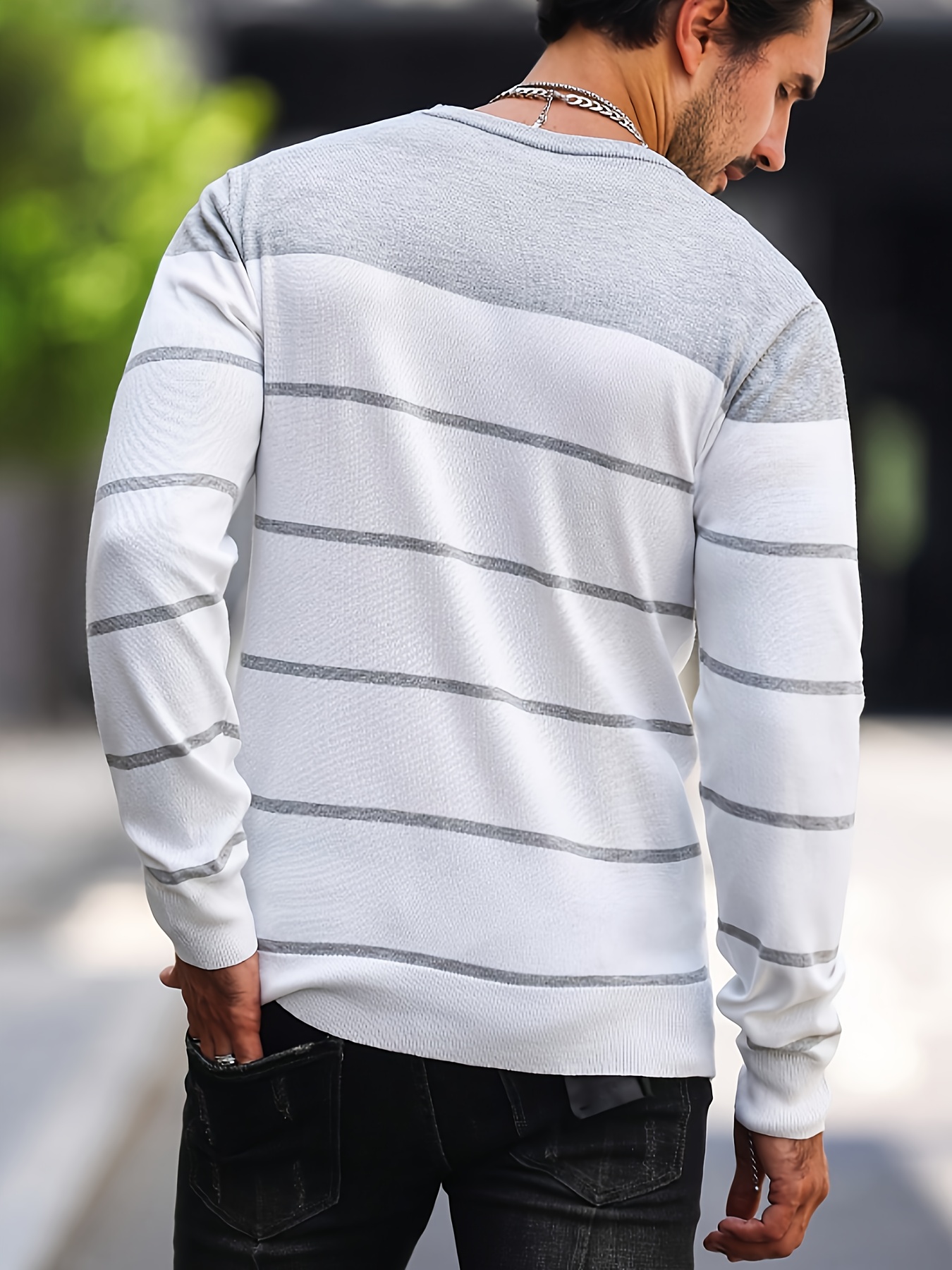 Men's Casual Striped Knit Pullover Sweater - Navy & White Contrast, Regular Fit H-Silhouette, Long Sleeve Crew Neck, Medium Stretch, Machine Washable for Spring & Fall, Medium-Stretch Fabric, Knit Sweater, Seasonal Clothing, Ribbed Detailing, Durable Construction, Versatile Top, Streetwear Style