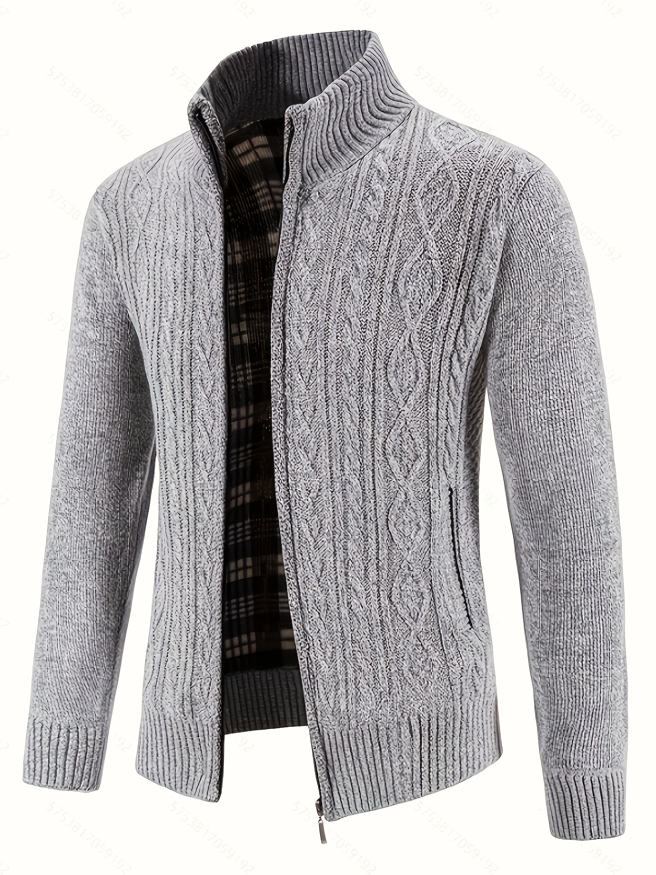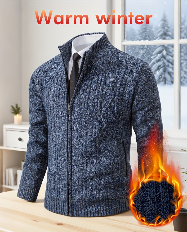 Men's Business Cable-Knit Sweater Jacket with Stand-Up Collar - Machine Washable Gray Winter Office Sweater Coat, Long Sleeve Casual to Meeting Wear, Gym Compatible for Professional & Everyday Use - Solid Color Mature Style
