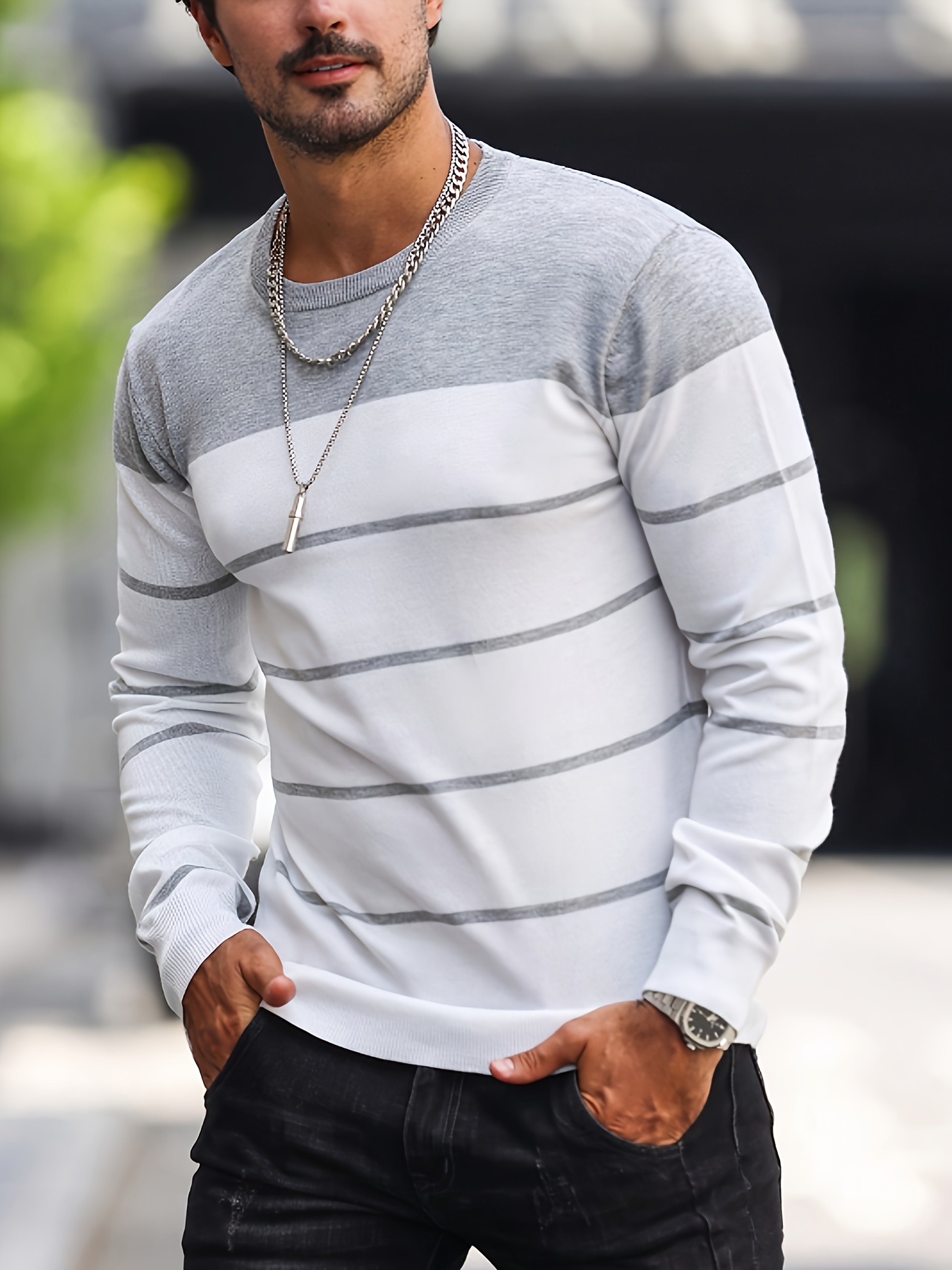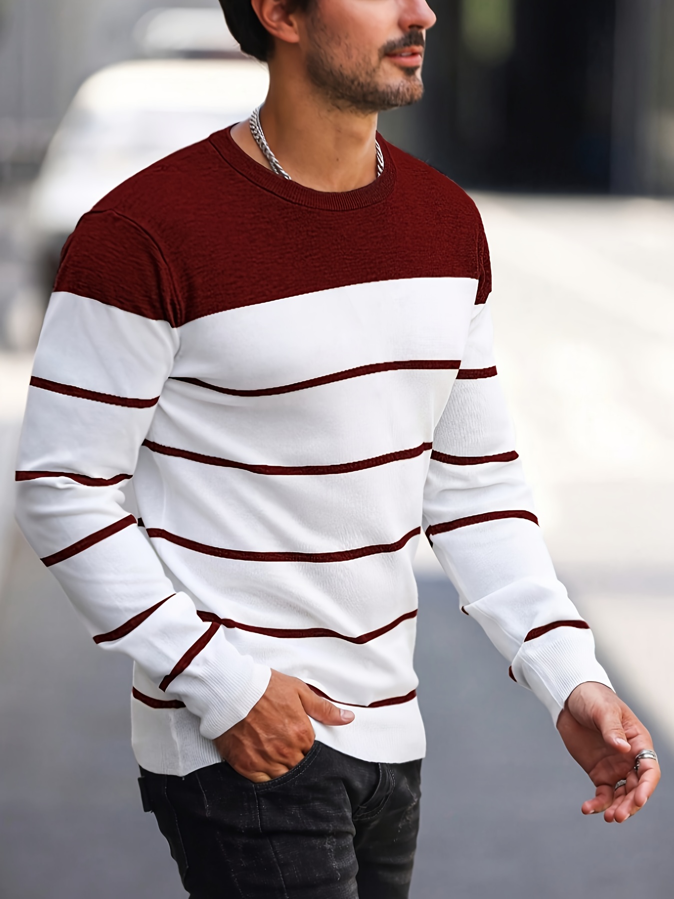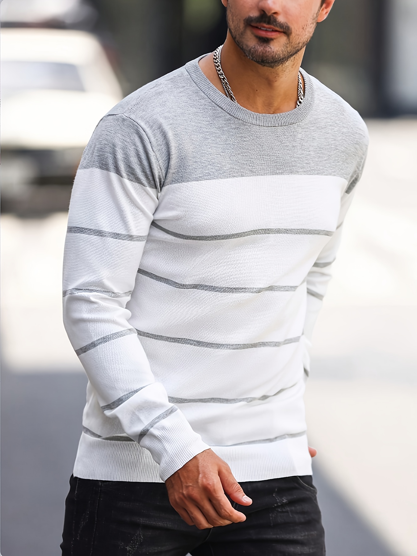 Men's Casual Striped Knit Pullover Sweater - Navy & White Contrast, Regular Fit H-Silhouette, Long Sleeve Crew Neck, Medium Stretch, Machine Washable for Spring & Fall, Medium-Stretch Fabric, Knit Sweater, Seasonal Clothing, Ribbed Detailing, Durable Construction, Versatile Top, Streetwear Style