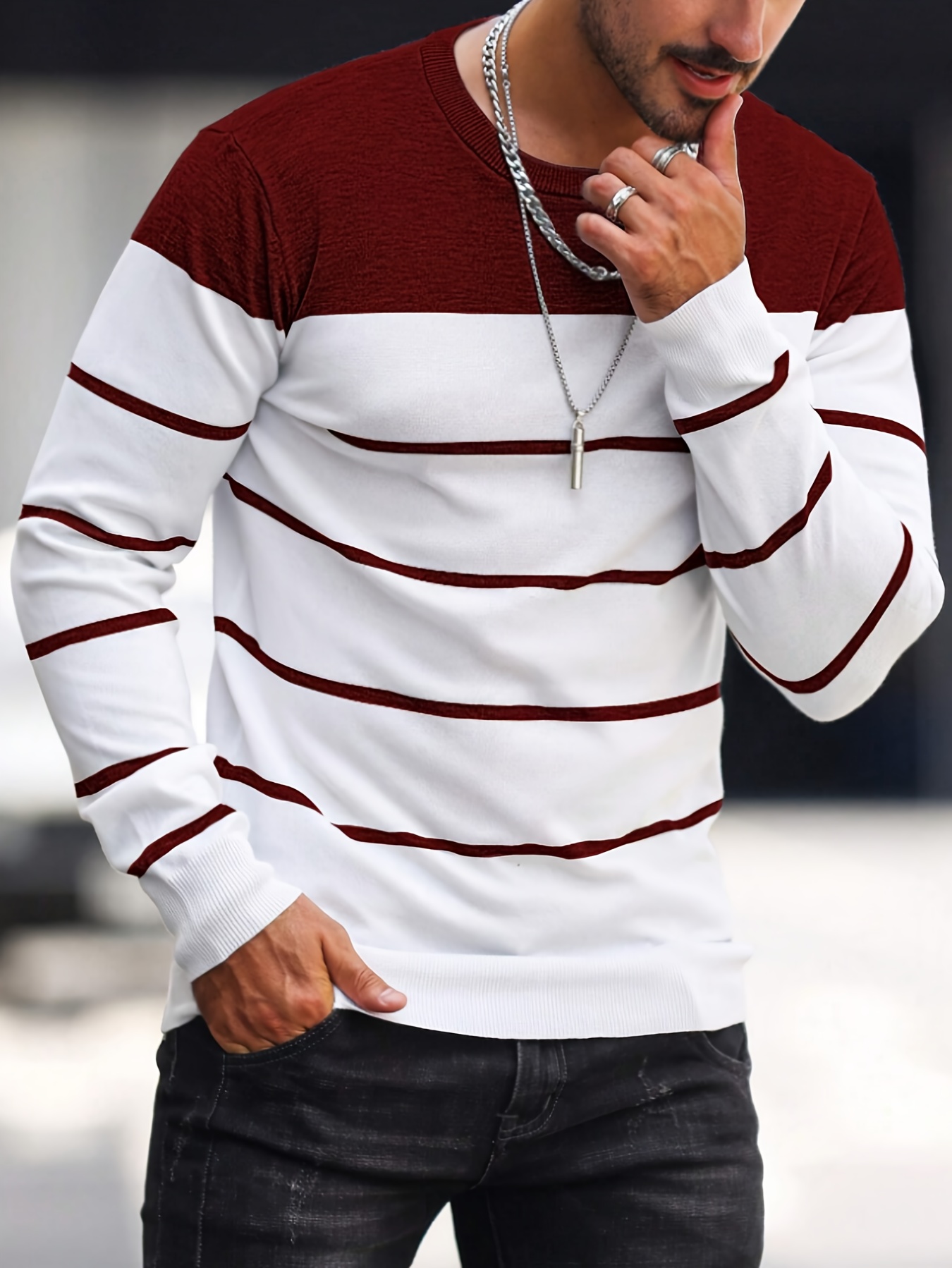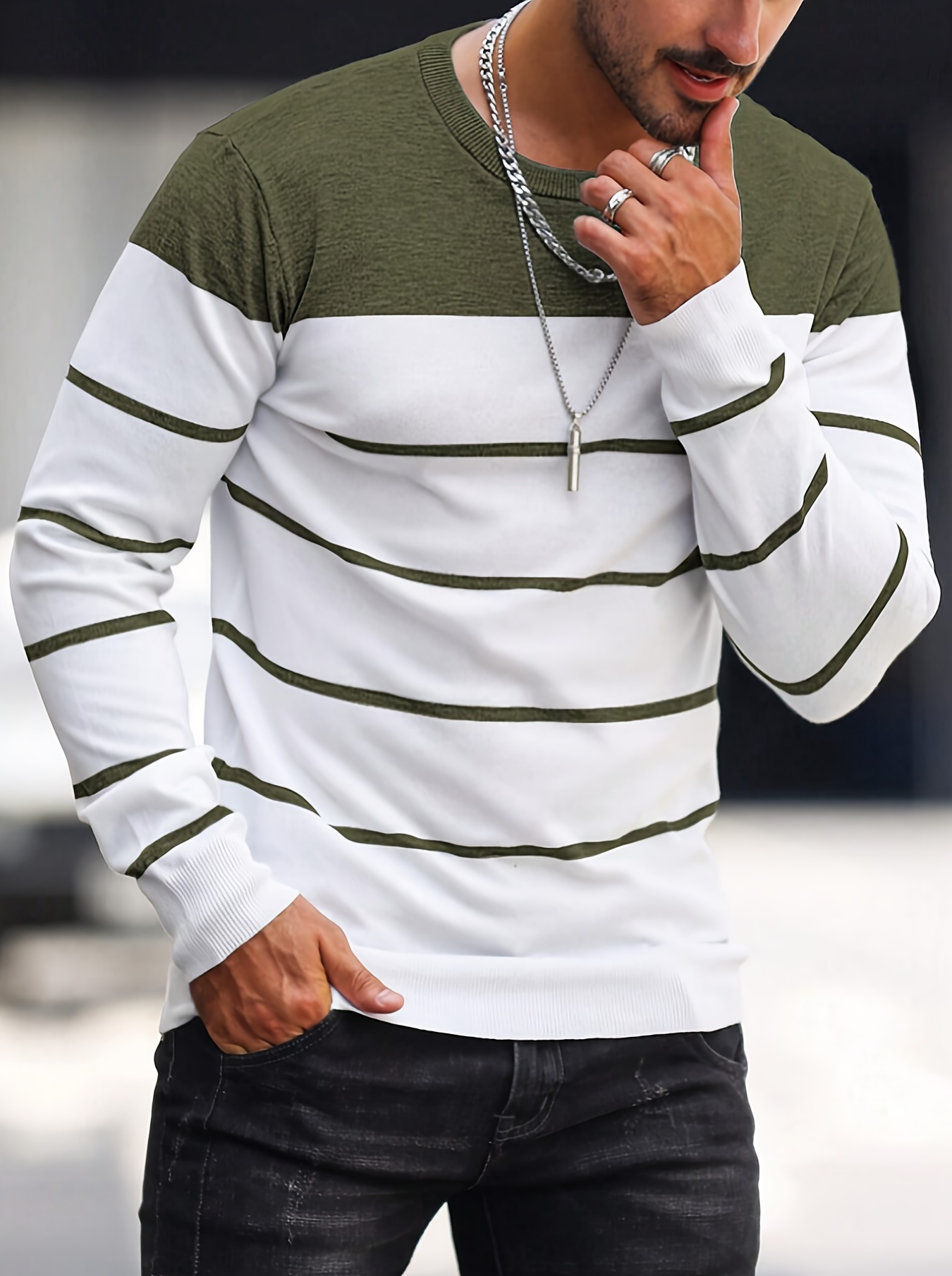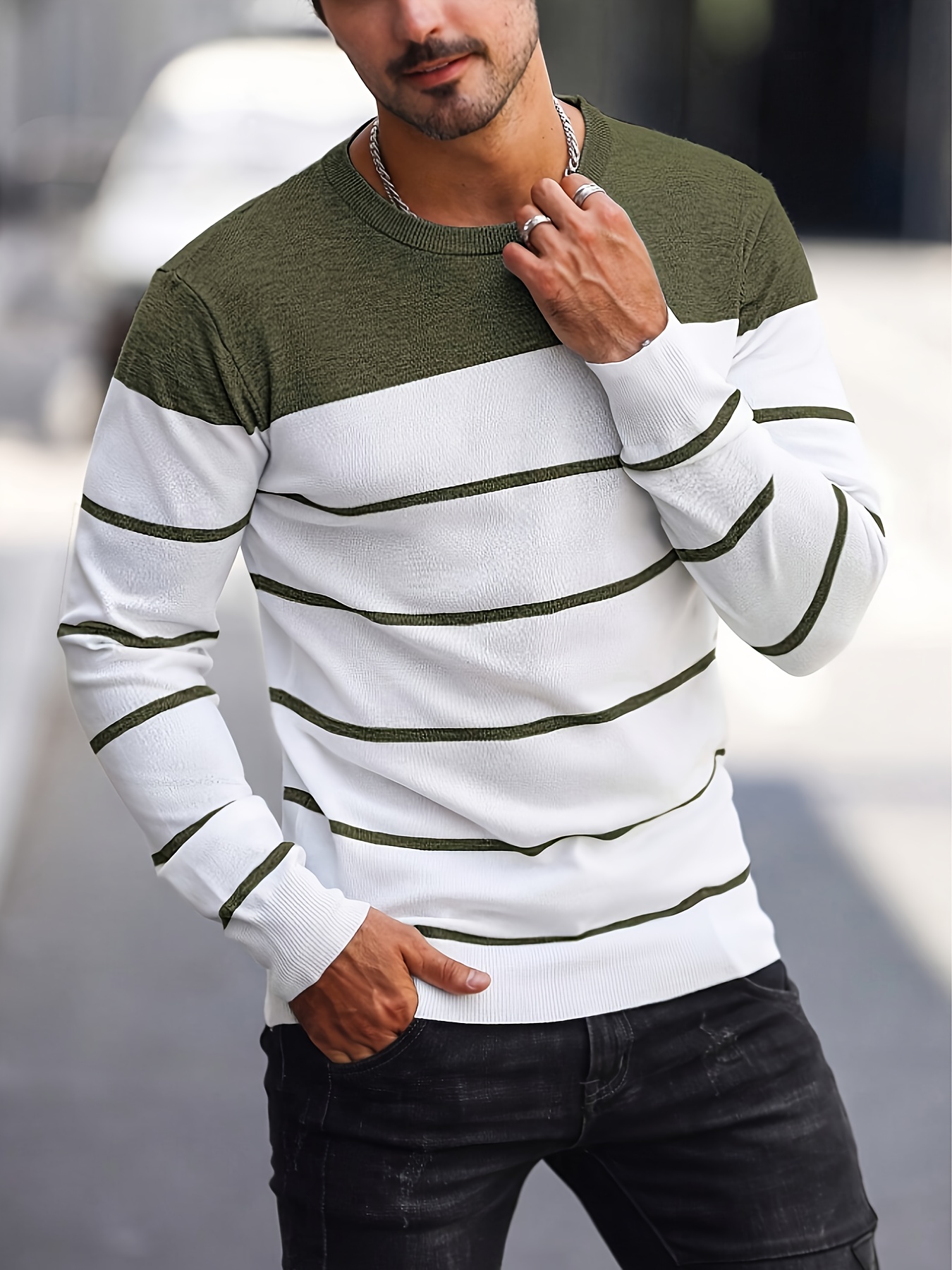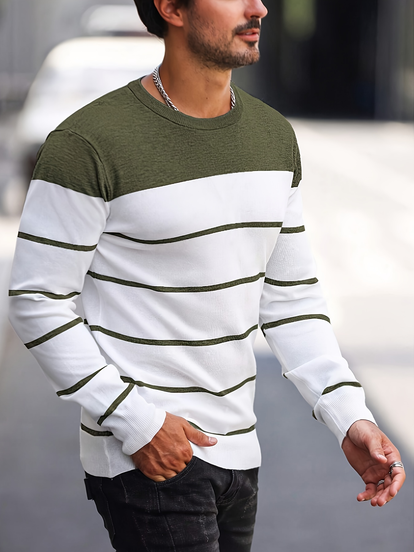 Men's Casual Striped Knit Pullover Sweater - Navy & White Contrast, Regular Fit H-Silhouette, Long Sleeve Crew Neck, Medium Stretch, Machine Washable for Spring & Fall, Medium-Stretch Fabric, Knit Sweater, Seasonal Clothing, Ribbed Detailing, Durable Construction, Versatile Top, Streetwear Style